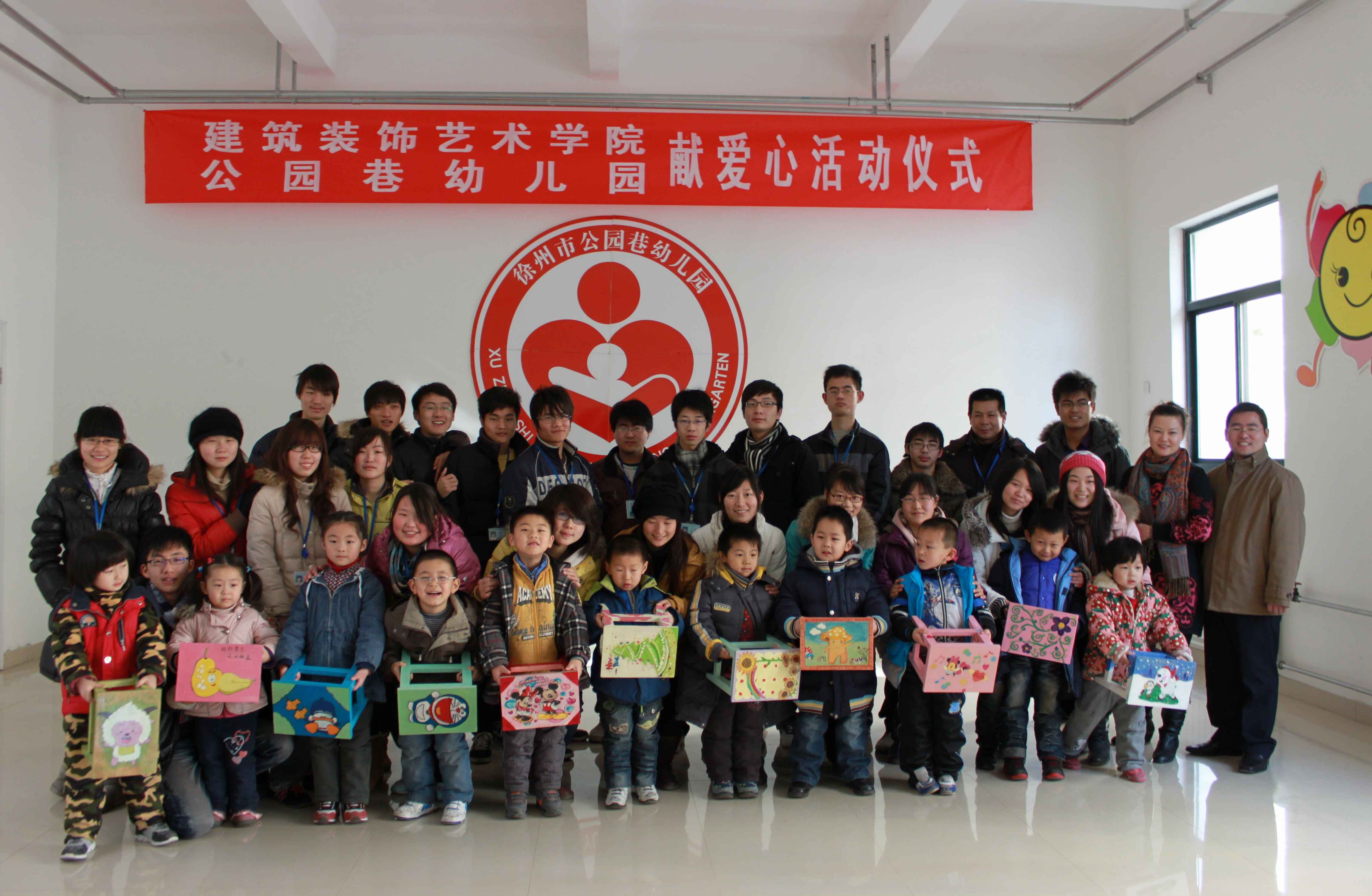 1230,建筑装饰艺术公司在徐州市公园巷幼儿园举办了一堂别开生面的“主题班会”——爱心捐赠活动。建筑装饰艺术公司党总支副书记葛志亮、2009级兼职辅导员马华锋、2009级装饰专业员工参加了此次活动。