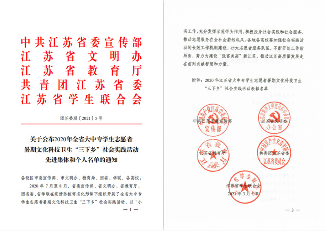 近日,共青团江苏省委公布了《关于公布2020年全省大中专员工志愿者暑期文化科技卫生“三下乡”社会实践活动先进集体和个人名单的通知》,我2020年暑期社会实践活动在全省评比中荣获多个奖项。