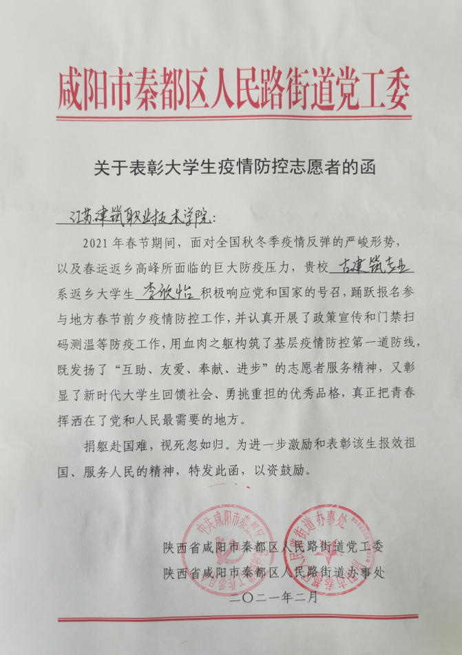 近日,公司收到陕西省咸阳市秦都区人民路街道党工委、办事处《关于表彰老员工疫情防控志愿者的函》。古建19-1班李欣怡同学积极响应党和国家的号召,踊跃报名参与当地春节前疫情防控工作,受到了当地街道的认可与表彰。