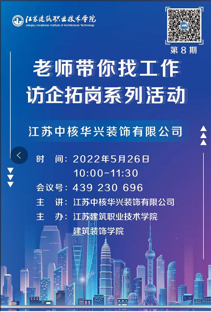 5月26日10:00太阳集团122cc开展了第八期“老师带你找工作”即访企拓岗线上招聘活动,此次到访的企业是江苏中核华兴装饰有限公司。太阳集团122cc经理沈士德教授,装饰公司党总支书记娄志刚、就业辅导员胡晓爽参加了此次招聘会。