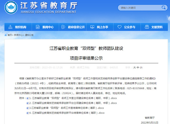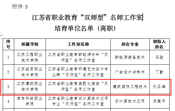 近日,江苏省教育厅公示江苏省职业教育“双师型”教师团队建设项目评审结果,公司孙亚峰教授领衔的江苏省职业教育装配化装修“双师型”名师工作室入选江苏省职业教育“双师型”名师工作室培育单位。