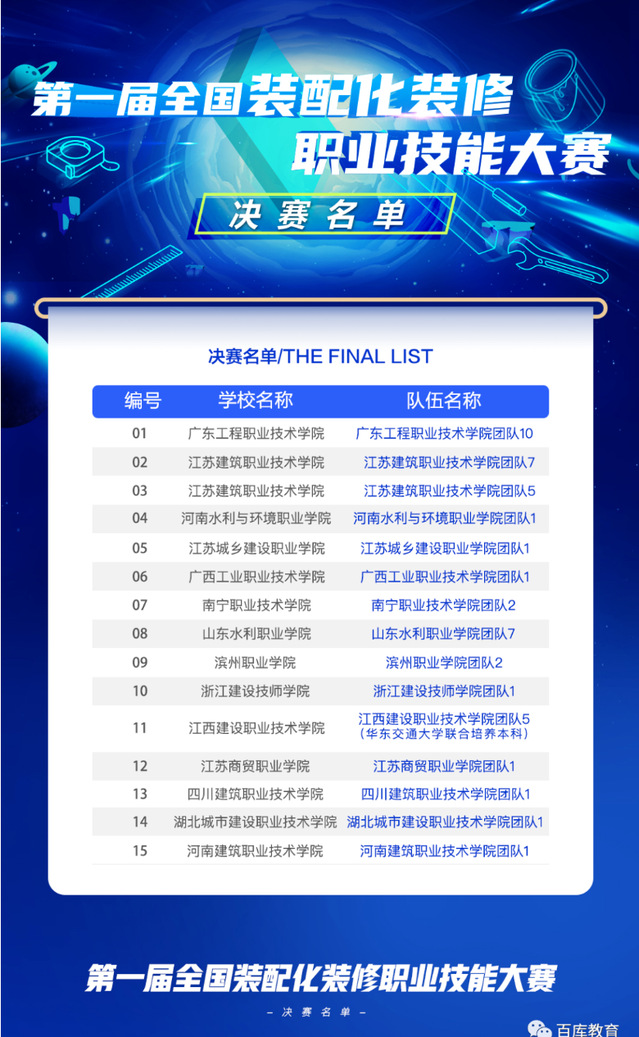 本次选拔赛,共有15个团队进入“第一届装配化装修职业技能大赛-决赛”。公司有两支代表队进入决赛名单。
